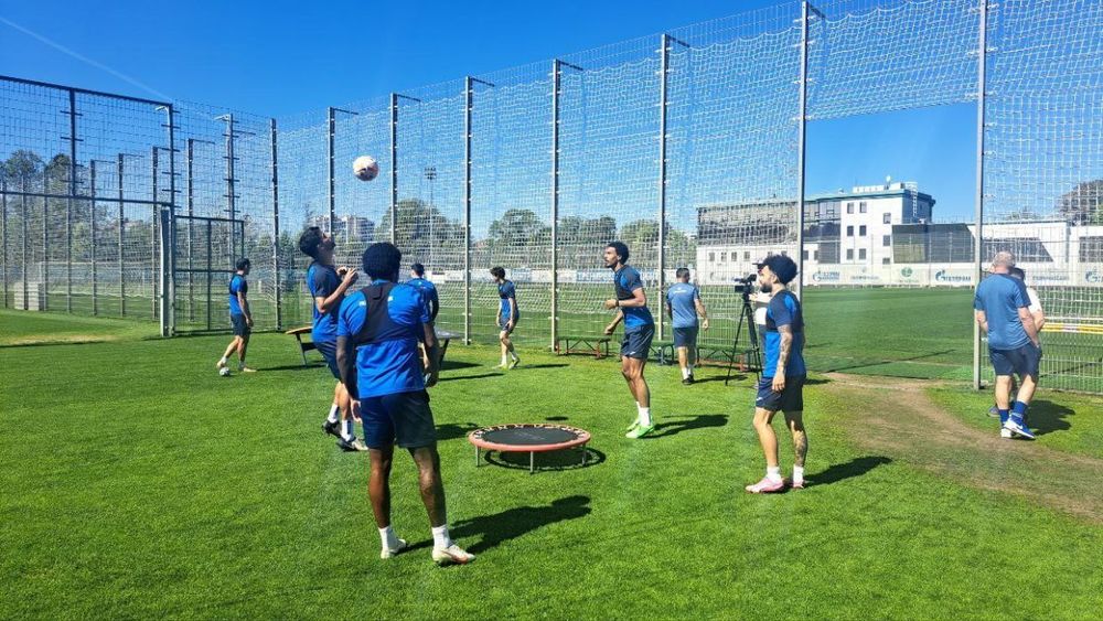 Тренировка началась с традиционного собрания, на котором Сергей Семак рассказал о плане тренировки. После этого немного беговой работы, а дальше игроки поделились на группы и перемещались по таким станциям-упражнениям. Не новое для тренировок «Зенита», такие занятия уже перед журналистами петербуржцы демонстрировали. Два стола для текбола, упражнение с переброской мяча через ленту, и еще одно с применением небольшого батута.