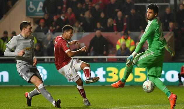 «Бристоль Сити» выиграл у «Манчестер Юнайтед» в матче 1/4 финала Кубка английской лиги. Игра, проходившая в Бристоле на стадионе «Эштон Гейт», завершилась со счетом 2:1 в пользу хозяев.