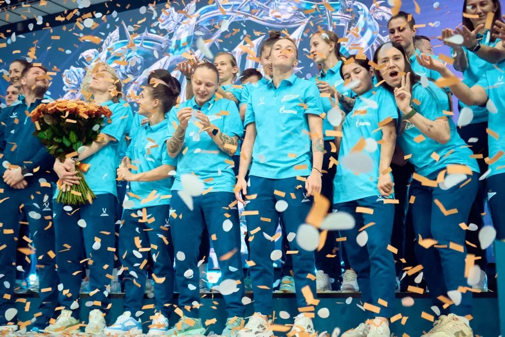 Главный тренер Алексей Тарасюк, тренерский штаб и футболистки сине-бело-голубых вышли на сцену «Газпром Арены» и представили кампанию на сезон-2026 — «Шипы и розы».